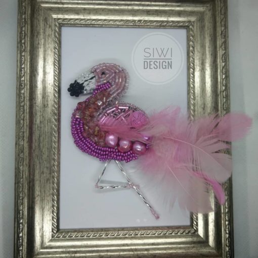 Flamingo Brosche. Perlenstickerei u.a. mit Frischwasserperlen und Edelsteinchen.